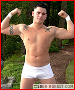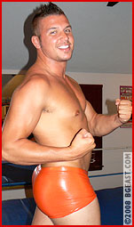 Nick's undefeated in his BG East career'we haven't seen muscular Catalog 66 coverboy Tristan since the beating Nick handed him on Fantasymen 30'Naughton is eager to prove Donnie nothing more than another picture-perfect prettyboy to pound. He stretches outside the ring in anticipation. But when Donnie enters, it's with a helping hand that has Naughty Nick gasping for air as his head is forced deep between his own wide-spread thighs! Kicks to the back, a flurry of forearm smashes, a standing reverse headscissors and overwhelmed Nick is flying through the ropes and flailing helplessly as Donnie goes wild in the ring. 'Look at yourself!' Donnie demands, twisting Nick's neck violently, scant inches from his mirror image. Rear and side bodyscissors, stomps, a rude, crude face-smearing slide across the rough ring canvas sets Nick up for a vertebrae-breaking hangman over the top rope with Donnie torturing him from outside the ring.