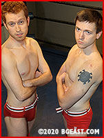 Calvin and Jonny enter in jungle-cat-print trunks, ready to give their opponents a reality check and a few rosy welts. These two faced each other in Hunkbash 18, which won the 2016 audience poll for Best Submission. They know each other well, their strengths and their weaknesses, and they know that even at their weakest, either one of them could tie their two overly optimistic opponents together in a knot. Easily.