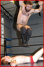 Evans tries to tag out, but Calvin pulls him into a reverse bearhug, then a standard chest-to-chest hug, either one of which could probably have knocked Charlie out had Calvin been inclined to drastically shorten the match. Jonny and Calvin join forces in double-teaming on Charlie in their corner before Calvin tags Jonny in. Cap averts his gaze while his partner suffers the beatdown of his life at Jonny's hands. Cruelly, Jonny toys with Charlie like a cat on a mouse, taking some time to add some handprints to Evans's smooth ivory chest.