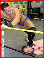 One moment of too much confidence allows Charlie to leap onto the would-be heel's back and slap a sleeper on the stud, but Chet isn't a rookie any more, and he's not about to let this upstart - this little red-head punk - put him out. He turns and slams himself, Charlie first, into the ring corner, again and again and again until the hold is broken and Charlie is slammed back down hard to the mat. The good news is Charlie is alert enough - despite this beating - to slap another surprise hold onto wannabe heelstar Chet. The bad news is Chet is just too experienced and too strong for Charlie, as the trainee soon finds out! And Chet is no longer amused by this game of cat-and-mouse - now his own pride and anger have been roused, and heel graduate Chet has nothing but destruction and humiliation in his lesson plan. "Let's see how much punishment you can take," he snarls, and all Charlie can hope for now is that there isn't going to be a homework assignment...