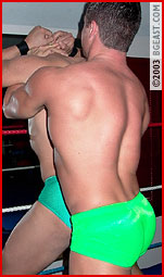 Italo hunk Gianni LaMotta loves playing to the camera, certain that viewers will love him as much as he loves himself. So does Jimmy Gee, smiling as he climbs into the ring and deliberately steals LaMotta's spotlight. They face off like bodybuilders on stage, each trying to outdo the other--peaked biceps, chiseled abs and four of the thickest and most cut thighs ever to grace a wrestling ring. LaMotta may be arrogant, but he's not blind. Conceding defeat to his shorter but more muscular opponent, he challenges Jimmy to a test of strength that seems a no contest--until LaMotta goes to the gut! Multiple clotheslines, forearm smashes to the chest and back, a truly breathtaking bodyscissors--not enough! There's a new Raging Bull in town as LaMotta strips Jimmy Gee to a butt-baring t-back and chokes the hurting hunk with his own trunks! But Gee's no helpless prettyboy. Showing major spunk, he rams his opponent into the turnbuckles, snapmares him and returns the insult--stripping cocky LaMotta to a loose-fitting thong that exposes far more than he meant to show! Intense action! And, as a bonus, JImmy Gee sports the biggest bulge this side of Josh Goodman.