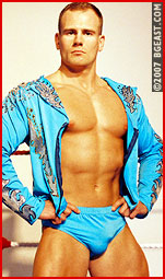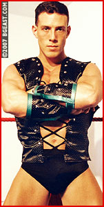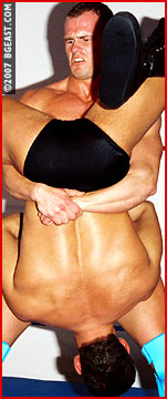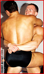 Ultraheel Max could barely wait to get his hands Ultrahunk Wade, the classic Marine good-guy, a MATT drawing cum to life! Max in all black, trunks, boots, vest, taunts the posing prettyboy. Wade surprises the tough guy with some newly-learned moves, and even manages to apply his big bearhug, straight-forward and upside-down! Our soldier boy takes a ton of abuse from the enraged Max: "You're not quitting on me yet!" he yells as he bangs Wade's face into the turnbuckle. A bulldog headlock, more abuse, and a brutal backbreaker do the trick as Wade's big muscles and growing bulge stretch out over the dark stud's shoulders. Max strips Wade, then unveils his own huge, hard weapon, and goes back to work on that injured back. Max is never content with just one submission!
