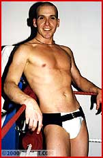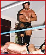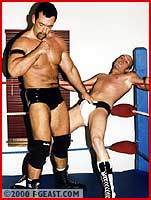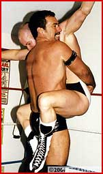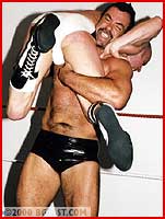 Both these guys made some waves when they recently made their debuts. Powergunz got his initiation at the hands of the BBW and Jonnie's double-hard-on spandex extravaganza with Jarett Cole will go down in BG's Sexfight history. But here, despite valiant effort and high-flying skill, Jonnie is outweighed, outmuscled and outclassed. Heeding the BBW's admonition to "beat 'em or be beat", Powergunz calls his opponent "Jobber Jonnie", & it's clear he's made his choice. Gunz' big hairy chest and verbal tirade, are backed up by a bearhug applied and reapplied, gutbusting and his trademark crushing headlock, face smother pins and scissors. Jonnie's big pouch gets displayed beautifully as he suffers.