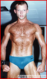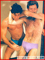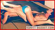 This match features a more muscular and aggressive Chase making him more than an equal to the wiry but skilled Scott Rogers. Fast and furious, sweaty and sexy barefoot grappling! Chase's tight, sexy sweat-soaked bikini gets yanked and stretched revealing the lean, muscular legs and buttock muscles underneath. From the initial testy college-boy repartee, Chase gets down to business using his bulk and strength to give mouthy Rogers a real tussle on the mat. Grabbing Scott's manhood, Chase roughs it up and asks if Scott likes it. Scott returns the favor, grabbing Chase even harder: "I like THIS!" Powerful Chase nearly yanks Scott's trunks off him as he muscles his leaner opponent around the mat. This 'newer' Chase is feisty, cocky, arrogant and so much more willing and eager to tangle. Frustrated at what he thought would be a pushover, he nearly strips Chase to beat his sexy bare butt. Close-ups of big crotches, cocks in faces, headscissors, and a crotch-to-crotch grapevine leg spread make this a hot battle from every angle. Scott's suffering is severe and prolonged as he's forced to give up in the first fall. The battle is joined! There's tit-tweaking, ass-slapping, ball-grabbing, face grinding, butt humping, stomach pounding, cock biting, gut wrenching, and rib squeezing action, all highlighted and exacerbated by repeated and creative sexual taunting. Great performances by both wrestlers.