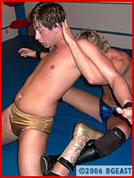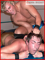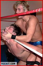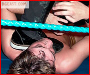 Caleb regroups and recharges. Soon he's flying again, as both young fighters realize the other isn't just going to give up or go away! And neither shies away from making nefarious use of the ring ropes and turnbuckles - and both end up tangled and tortured tied. Chops, backbreakers, kicks, stomps, body slam after body slam are employed to sap the fight from the other. Variations of a wide variety of submission holds are cranked on to get Caleb his equalizing submission or Jean his deciding fall. Big bone-rattling bumps lead to near pin after near pin. But despite the intense punishment, neither is willing to yield to the other. Caleb's vicious and methodical assault on Benoit's back finally evens the score at one apiece. There's one fall left to decide the winner, and the determination to not lose shows on each face as they start the third fall. Caleb immediately goes after Benoit's back again, but Jean Benoit is not someone to just lay there and take abuse - he's got grit and the heart of of true fighter, and he wants the win just as badly. The battle rages on, and as each wrestler becomes more determined to raise their hands in victory over their beaten foe, the action gets faster, the tactics dirtier and nastier, until finally the match comes to a stunning conclusion that leaves one wrestler humbled and beaten as his victorious opponent poses and struts around the ring as the unequivocal victor! This is pro ring action at its very best - one you will watch over and over again. Get your slo-mo and frame-by-frame ready - you won't miss a move! An instant Pros In Private classic!