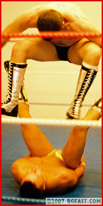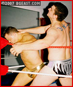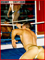 Kieran arrives at the ring first and starts warming up with a series of calisthenics to get his muscles pumped and warm and probably not inadvertantly, to show off his power-packed body and very well-packed goldenboy bikini. Guido strolls in a little later, and Kieran, never at a loss for a provocative comment, opens his mouth. ?About time you got here, little bitch,? he taunts, holding the ropes open for Guido to climb through, and can't resist the urge to give Guido a little kick in the backside. ?I?m gonna kick your ass.? He boasts. They start circling, and the match is on!