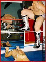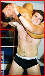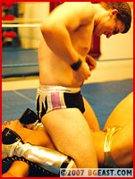 In this match-up Kieran is the true classic cocky babyface, not a jobber. And the distinction will be perfectly clear. And Guido is by no means uncertain of his role, as Kieran discovers much to his considerable agony! Guido uses the ropes, the corners, his knees, elbows, boots and butt - all to the detriment of our favorite Goldenboy. This match is proof positive that no one does pro better than BG East.