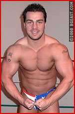 Down goes Braden, and with him any chance he may have had against the Marauder. Braden may have paid some of his dues already, but that was chump change compared to what he is about to suffer! The Marauder is highly skilled in the ring (who IS he?), and his skills are supplemented with a deep arsenal of dirty tricks. He batters Braden mercilessly, even arching the sexy stud over the ropes, unwinding his wrist wrap and using that to strangle the muscleboy! As Braden collapses, barely able to catch his breath, the Marauder moves in for some more brutality. Braden is nothing more than prey for the masked villain, who enjoys toying with his victim much as a cat does with a crippled mouse. A hangman leaves the youth staggered and moaning, but the Marauder isn't finished with the stud just yet, this just might be the end of Braden's career, if he is able to crawl out of the arena when the Marauder is finished with him!