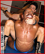 Few things are as distracting as the sight of Joshua's bod spread and displayed, but he powers free and turns the tables with a hiptoss. And when Joshua applies a modified crucifix, exposing that big, heaving chest for forearms, a surprising headscissor counter proves that, while this is the bodybuilder's first time in BGE's ring, this isn't his first match--until Mr. J stops him cold with a double fist to the gut. Heaving and gasping, Darius crawls to the edge of the ring. Mr. J shows him the ropes aren't just for containing the action, but for trapping musclehunks who naively believe their opponents will fight fairly just because they do. Mr. J rains down forearm after forearm as the bodybuilder flexes reflexively. A leg on the throat is classic heel, but Mr. J's jiggling basket as he milks the advantage is an entirely different subject. In fact, as much as we insist "action" is the primary focus at BGE, when Joshua chokes the helpless hunk with his booted foot, his legs extended in a nearly-full split, his not-quite contained, over-sized big bulging basket is going to get plenty of frame-by-frame attention!
