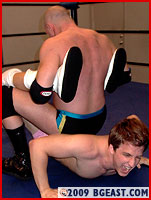 Skotch tosses his young quarry back in the ring and methodically works every part of Kirby's sexy body until it barely functions -- and then moves on to another part! Back breaker after back breaker, a Boston crab applied and reapplied, a mouth-stretcher camel clutch, body slams and suplexes, gut bashing, stomping and clawing, and you name it -- again and again Skotch goes to his seemingly bottomless arsenal of weapons to inflict serious hurt on the pretty rookie -- and it soons become apparent that one of Skotch's favorite old school 70's style matches is the 'end your opponent's career' match.