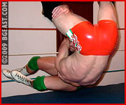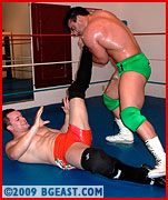 After a gentlemanly handshake between the opponents, the bell rings and the action is on! What follows is one of the finest exhibitions of scientific wrestling skill ever recorded in the BGEast arena. The two put on a clinic of holds and reversals that any aspiring wrestler should study. An impressive and complex arm lock sequence is followed by a series of headlocks and reversals followed by an exchange of skull-crushing headscissors! When the two warily get to their feet and start to circle each other again, they exchange respectful nods to the otherâ??s skill. Impressive! Two stars totally at the top of their game.