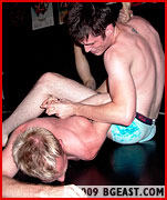 Blaine converts his rage into a brutal head scissors that has Christian howling out another submission! As Christian lies on the mat, trying to regroup, Blaine stomps on his stomach not once, but twice! But Blaine goes to the well once too often, and Christian grabs hold of his ankle and sends him sprawling! Payback time! Now, Christian goes back to the bear hug that worked so well for him earlier, lifting the smaller stud up and cranking on the pressure to his lower back and ribs. Again he slams Blaine down to the mat, but just as quickly drags him up by the hair and once again cranks on the tight sexy bear hug that has the blond boy gasping and whimpering in pain. It's a tight punishing, painful, passionate embrace which has Blaine both craving and dreading it. But as much as it may also excite Christian, he is determined hear Blaine admit defeat and squeezes and shakes Blaine until he is nearly limp in his arms and has no choice but to submit or pass out!