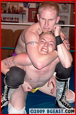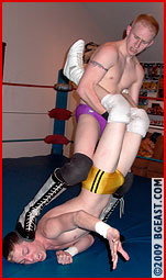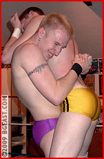 Tommy's crafty pin infuriates the usually inscrutable but always punky Paul, his anger further exacerbated by the dazzling display of highflying moves Tommy launches on the now discombobulated platinum blond heel! Tommy lands a pinpoint dropkick that floors the heel and then before he can fully regain his feet, Tommy sends him flying across the ring again! The rookie kid is on a roll and dare he even think it? Can he, in his debut outing, take out an established star? Paul, on the other hand, bides his time waiting for the rookie to leave him an opening to plow through so he can teach young Tommy a wrestling lesson he won't soon forget! Spectacular holds and moves from two sexy young blonds.