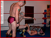 A dizzying rolling bodyscissors, and Justin gracefully bridges back, locking the dazed heel in a surely unbreakable pin: ONE, TWO.... A stomp to the gut by an intervening Leopard denies Justin the biggest victory of his career! Cornered, Justin fights for his life--body slamming the boss, and a charging Aryx Quinn! He's done the unthinkable and stands triumphant over three of the meanest heels in wrestling. But his triumph is short-lived. A nasty Leopard low blow, and Vicious locks the hunk in a reverse neck crank leaving him wide open for a 3-on-1 ab attack. Call it a figure 8--Aryx and Vicious lock figure 4's with Justin at alternate ends, while Leopard repeatedly claws and steps on Justin's gut. When Leopard wants a submission, a simple "I give!" won't do; he repeatedly forces Justin to yell louder. Peeled of his trunks, a sleeper variation from each of the heels spells doom for poor Justin The Just. And those baby blue babyface trunks? On prominent and permanent display in KL's trophy case!