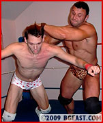 "You want to play with the big boys, huh?" J-Rock shakes his head as he stalks his hot hapless prey. Brendan is till too stunned to stir into defensive action. J-Rock proceeds to start throwing punches into Brendan's flat stomach with such force the kid is lifted right up off his feet! As Brendan's moans of pain intensify, J-Rock grabs his arm and whips him across the ring and back-first into the opposite corner like he was a weightless rag doll! The force of the whip ricochets Brendan back toward the center of the ring - and right into J-Rock's next battering blow! Back into the corner the kid goes once again! A huge high hip toss sprawls beautiful Brendan on his back, moaning, arching, and bridging as J-Rock ominously flexes those gigantic biceps. He drags Brendan up by the hair and sends him back into the corner with a resounding chest-crushing forearm smash Brendan is probably still feeling today! And then J-Rock targets that long lean torso and those oh-so-vulnerable abs: bare feet, fists, forearms, elbows, knees - all drive repeatedly into Brendan's belly.
