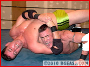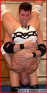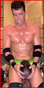 "Rise and shine," chimes Cole Cassidy. Matt Justice rouses, to find himself flat on his back on the canvas, Cole's legs astride his neck. He's looking right up at those red granite abs, feeling the heat emanate off the victor's sweaty skin. Wannabe heel that he is, Matt is not above fighting dirty, and, thoroughly whooped, with no possibility of an honest escape, he makes the dirtiest escape possible, by chomping down on Cassidy's burgeoning bulge.