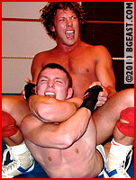 Things get vicious. Mac clamps an iron claw on Jonny's abs. Firestorm retorts by grabbing Mac's curly hair to bash his head to the mat and then rakes his boot cross his pretty face. Furious, Mac determines to end Jonny Firestorm's career once and for all. Firestorm looks him right in the eye as if daring him to give it his best shot. Each tries his best to defeat the other with punishing, painful and mind-boggling submission holds. They each nail the other with devastatingly big finishing moves which would leave any just-average wrestler down for a ten count or more! Both wrestlers then earn their monikers as "iron men," and the ultimate victory is, as we would hope, uncontestable, sudden, and brutal. Extraordinary, even startling action, the likes of which ONLY BG East can produce!
