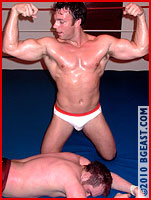 The two studs lock up, and the Dickster quickly snaps a side headlock on the eager Scot! Rory reverses the hold, and with a hiptoss takes the sexy heel stud down to the mat. Dick reverses again, and goes to work on the left shouder of the Scot: armbars, knees and elbows, and and wristlocks combined to try to rip his arm off at the shoulder! Yet somehow Rory manages again to reverse out of it-and the two go back and forth, unable to maintain an advantage until Dick goes for an eye rake that crumples the young Scot to the mat - and with the Scot stunned and unable to see, Dick attacks Rory's shoulder again, determined to destroy it once and for all! Rory's agonized screams echo off the Arena walls...can he somehow get back into the match? He manages to duck under a vicious clothesline and as Dick comes after him again, drops the sexy stud with a clothesline of his own! But Tricky Dick goes for the eyes again, and Rory's offense is cut short again.