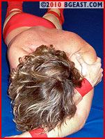 Basking in the afterglow of his first-fall victory, Tyrell poses and gloats. "I thought you said it wasn't all about THIS?" The big handsome bodybuilder taunts Bobby, flexing his huge biceps and admiring himself once again in the mirror. Beautiful beaten Bobby, his long hair flopping around his face and neck, grovels on the mat, holding his hurt ribs and battered back, suffering from the effects of Tyrell's tight and intensely breath-taking bearhugs.
