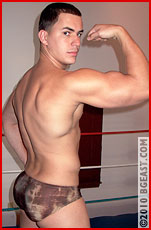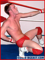 Cameron shows off his own body, striking a double biceps pose which, while reasonably impressive on its own merits, hardly intimidates or impresses the big Russian. With a roll of the eyes and shake of the head, Alexi crosses the ring, reaches down and gives the mouthy youngster a brutal bitch slap across the face. Cameron staggers back in utter shock and disbelief clutching his freckled face. "Dude, you gave me a fat lip!" Cameron snarls as Alexi grabs him and in a display of incredible strength, lifts him up and over the top rope and effortlessly tosses him clear across the ring! "Easy there, big bitch," Cameron says as he recovers his feet, holds his back and shakes his head in bewilderment. "You need to stop running your mouth," Alexi threatens, and then pointing at Cameron's rather provocatively sheer bright red trunks, asks, "Victoria's Secret?"