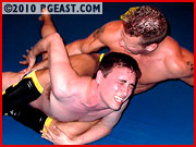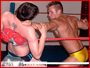 Punching a helpless Aryx Quinn in the abs is like poking an angry bear with a stick. It's just not a smart thing to do. Especially when Aryx Quinn has twice the muscle you do. The failure to comprehend that basic fact explains why CJ Parker is gasping for air, laying semi-unconscious on the mat, while Quinn towers above him flexing and showing off his powerful body. It's also the catalyst for Quinn to make an example out of the sweet suffering jobber. Aryx is smart, he knows that young CJ is head over heels in lust for him. He uses this knowledge to seduce his #1 fan, even allowing him to help peel off his yellow and black wrestling squarecuts to reveal a brief sexy yellow speedo underneath!