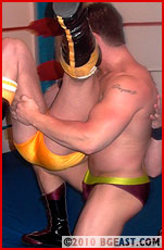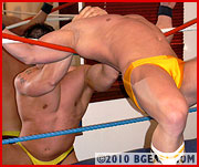 What follows is not entirely one sided, but one fighter consistently bashes his opponent, beating him down to a mere shell of his former cocky self. Braden dominates Kieran at nearly every turn. Braden wants nothing more than to prove himself a fighter to be reckoned with at BG East, home of so many legendary champions, and Kieran, it appears, is simply the man who got in his way. Lots of great muscle exposure on both men in this fight. Incapacitated before the match even starts, Kieran is all but defenseless against Braden's constant assaults. While Braden tries to shatter Kieran's vertebrae, Kieran tries to choke Charron out every chance he gets. Both men are highly focused, but Braden manages to call nearly all the shots. Can Kieran pull a surprise, last-minute reversal? It doesn't look good. Braden Charron shows that, unless he can be stopped, he means at last to shed his pretty-boy image and be taken seriously - by Dunne, by The Boss, by the fans, and by any poor sucker with the bad luck to get caught in his sights in the future.