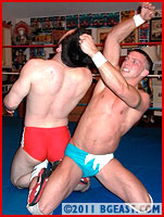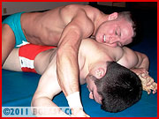 Soaking up Jonny's assault like a sponge, Rudy refuses to give an inch. He snags Jonny's feet out from under him and a half a second later has the hard-bodied hunk in a crotch-ripping small package, shoulders pinned squarely to the mat. Rudy delivers a slow, deliberate 3 count and then follows up by pounding his fist into Jonny's quivering hamstrings until he submits. Rudy picks up right where he left off, slamming Jonny to the mat repeatedly. Blow by blow, he breaks invincible Jonny down into pieces, finally delivering a flying splash, hooking the leg, and slapping down a second 3-count pinfall.