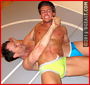 Both wrestlers offer crumbs of grudging respect, but with so much on the line for both this match was destined to turn nasty. Gradually but inexorably, they begin to bend the rules of gentlemanly combat. Punishing holds are sustained well beyond the point of securing a submission. Schoolboy pins turn from domination to humiliation, as the Z-Man finds Patrick's crotch resting on his chin. "Cozy there?" Patrick taunts before reaching behind him to pound his fists, again and again, into the muscle boy's very inviting torso.