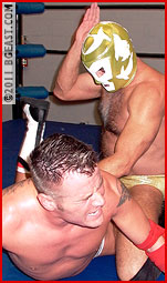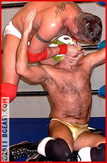 Stomps to the back, kicks to the side, and that atomic wedgie exposing a hairy butt cheek are all part of the brutal assault. Cage is tossed into the corner and punched and stomped until the big hairy thug collapses to the mat! A brutal leg split and a couple of boots to Cage's own ample package leave him sprawled over the lower rope - convenient for a little choking! A big bodyslam almost gets Jobe a three count -- but Cage is able to lift a shoulder. Jobe continues working over his hairy opponent -- launching into the air for some major stomps and knee drops! And then goes for Cage Thunder's mask!!