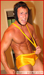 Austin Cooper uses his extra muscle to reverse, rolling Jake back and over, stretching the man's thighs flat, for a clean and sportsmanlike pin. First fall goes to the taller blond! In the heat of exertion, though, he accidentally busts the corner of Jake's mouth. Oblivious, he springs to his feet to pump his muscles and gloat. Jake snarls, fingering his tender lip. "Nobody makes me bleed!" His voice rises in intensity. "You made me bleed, man!?!" You can see he yearns to take the fight to the next level - now!