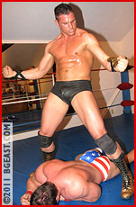 The experience has definitely amped up Donnie's confidence. He struts to the ring, not saying a word, the door slamming ominously behind him. A black sheet of fabric wrapped around his broad shoulders (What the hell is it? A cape?), gold(!) boots, industrial black leather trunks, flashy metallic gladiatorial shin and forearm guards, a stern, expressionless mask of a face. What an entrance! What a statement! And what sinister charisma! Here's the climax of Drake's evolution at BG East over the years - first as the grinning, game-for-anything boy-next-door, then as the heavy-handed heel with a heaping side of sadism, and now this - evil incarnate, darkness visible, really really bad news.