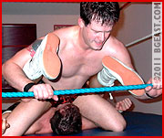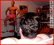 Jarret is itching for trouble when he makes fun of Patrick's pink trunks - correction: pink star-spangled trunks! A slap to the face is both an affront and a stimulant, and the boys roll themselves up into a great big writhing ball of whoop-ass. Cole dominates from the start, stretching Pat to a prolonged and agonized submission for the first fall, punctuated with sadistic ball torture. Any of us might have difficulty hiding a boner after twisting silky smooth Patrick into a dozen humiliating configurations, but Jarret doesn't even try to hide his. The bulge shamelessly and boisterously asserts his claim over Donovan, body and soul. If Cole is not already widely recognized as the horndog prince of BG East, this match will do much to, um, solidify his claim to the title. By the middle of the second round, it's crystal clear that Cole really does not mind Donovan's taste in pink spandex at all.