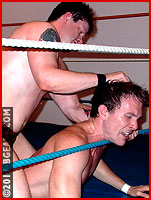 We would be remiss if we did not also praise this match's displays of rope work. Pressing a man up against the ropes offers maximum opportunity to rub skin on skin and muscle against muscle - to say nothing of the thump of a stiff cock on top of another. When Jarret traps Patrick in the corner, the body contact is sexy - sexy in plus sizes. This match is a near-perfect balance of sensual excitement and havoc from beginning to end. It's a testament to the pluck and fortitude of two of BG East's best talents. This match shoots live sparks, not only spotlighting Patrick Donovan's enormous appeal and talent but also exploring the primal passions that wrestling excites in a lot of its fans. A WINNER!