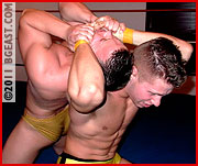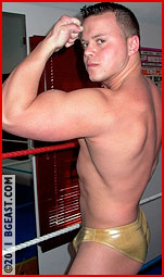 And the delicious beating goes on, as Kieran repeatedly cries out in agony - those pretty in pink trunks earlier proffered by Aryx come back to haunt the humpy babyface. "You're going to be a star, little man, a STAR!!!" Aryx taunts over Kieran's screams.... This match will push all your buttons: two ambitious young BG East rival superstuds at the pinnacle of their muscular perfection vying to impress the fans (and The Boss) with their attitude and skills - not to mention two sets of extraordinary derrieres! A killer opening match!