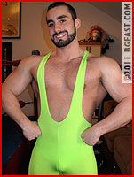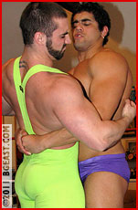 "I think I ought to crush you with my thighs," Rex snaps back, pulling the leggings of his lime green singlet up to better illustrate the astonishing thickness of his upper legs. The psychological warfare is already raging well before they lay a hand on each other. Marc stubbornly refuses to make eye contact as he strolls around the ring, examining his own smooth, bulging body. Rex's pecs dance in anticipation as he predicts his victorious coming out party as BG East's new beast to be reckoned with.