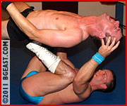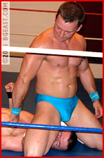 "C'mon, be a bad ass," Jonny taunts his man as the third fall starts. He revisits some of the strategies he used to break Hawk's spirit in the first two falls, extracting three quick and wincing tapouts in succession. "Are ya tryin' to kill me or what?!?" Hawk squeaks, as Jonny just stares down at him icily. Then he twists the recruit into a dozen tight knots that Hawk never imagined possible, much less learned at wrestling camp. It's a hard and cruel lesson that Rodman has to learn. The difference between a wannabe heel and an ultra heel. It's more than the right gear and the right haircut. It's more than simply wanting it so bad you can taste it. It's all about having the basic instincts for cruelty and the quick, agile moves of a predator. Nobody but nobody gives a licking like Jonny Firestorm - and there's nobody but nobody he'd rather give one to than an upstart who thinks - in his ring debut, no less! - he's got the stuff to join the ranks of BG East's Ultra Heels.