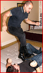 The look on Chris' face says it all: mission accomplished. He's bested the infamous Rob Chandler in record time. As they climb to their feet, it's almost as if he expects Rob to congratulate him on a job well done. Instead, he gets a knee to the gut that drops him like a rock, followed by a combat boot stomping party in which "little" Rob cuts the big man right down to size. Chris' element of surprise is one thing, but a blue collar beatdown from the Birmingham badass is like a force of nature. The tone is now set: this is gonna be one tough, mean, punishing indoor streetfight! The sexual attraction here is palpable and the subtext obvious but right now it's definitely taking a back seat to the need for each of these studs to punish and prevail. A standing surfboard with a big black boot shoved up Chris' sexy curvaceous butt evens the score, fast and furiously.