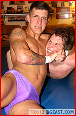 Typically Rolf plays to the camera, unable to get enough of himself as he plies his knuckles against Gavin's thick muscle. There's more to him than just braggadocio, to be sure, but he's got no shortage of bark, too. As Gavin repeatedly powers out of holds that Rolf thinks should be finishers, Rolf resorts to more underhanded tactics, more than once delivering forehead butts to Gavin's groin. It's a sign of his character (and perhaps delusion) that Rolf counts cheap shots like these as signs of his superior intelligence. The punk's tenacity and nerve are nevertheless impressive. At one point he leverages a Boston crab hold on Gavin by clamping his teeth onto the middle rope! The tension and mayhem escalate by Fall 3. If both these guys have a ways to go before they measure up to the ring veterans, they fairly explode with potential in this first match. With new young super-talented and super-sexy guys like these in tow, BG East is pushing great ring wrestling into the future!