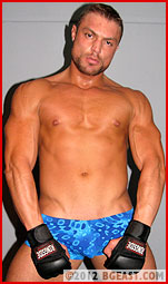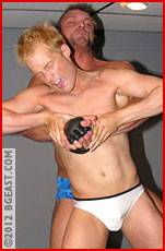 Kieran and Eddy look at Blaine and shake their heads. Which one of them should put the first dents into this cocky upstart? The new, more aggressive Kieran was the first to confront Blaine in the gym, so he decides to go first here. Immediately, Blaine nimbly slips under Kieran, through his legs, and hops on his back to apply an immobilizing full nelson. Kieran is in shock, and so is his partner, his mouth gaping from the edge of the mat. Kieran uses his weight, backing up and smashing his assailant to the wall. The blow shakes Blaine loose, and yet still he outwrestles the startled muscle god. It looks like Blaine might have been right after all, as speed and nimbleness overcome size and strength. Blaine gets the first win, by submission. Eddy wants to take on the Canadian next, but Kieran pushes Eddy out of the way, determined to overcome the insult of a "lucky" win, and smashes into Blaine, ruthlessly targeting the man's back and neck. Yet again, though, the smaller fighter reverses, soon handing the mirror-obsessed he-man his second humiliation in a row, as Eddy shakes his head in appalled amazement.