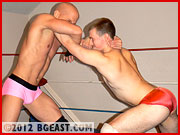 Both Mike Pitt and Lon Dumont cut their teeth at BG East by fighting bigger wrestlers, Lon with more success than Mike. From the beginning, The Boss threw young Mike to big, carnivorous heels like Bulldog Barzini, Donnie Drake, and Exavier. Lon amazed fans and peers alike with his fighting spirit against the likes of Eddy Rey, Joe Robbins, and Morgan Cruise, men close to twice his size. The contrasts in looks and styles are even more striking. Handsome Mike is the meatier of the two, a regular-looking guy who does not rely on gym membership and fad diets to maintain his strong and healthy build. By contrast, mean and sexy Lon measures every bite he eats with the compulsive exactitude of a chemist mixing solutions and has a body as lean and finely tuned as a ninja sword. He spends a quarter of his waking life in gyms and workout rooms. For Lon a pizza is what a crucifix is for a vampire. Mike is quiet and easygoing, though he's fond of a good tussle now and then, for kicks, just to get his juices flowing. Lon has been arrogant from Day 1, boasting of his abs (they ARE killer) and purported invincibility in the wrestling ring. He too likes to fight, and as he has risen through the ranks at BGE, he's come to fight mainly for the pure, vicious pleasure of damaging his opponents.