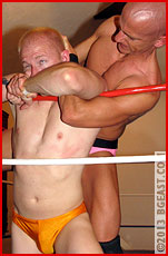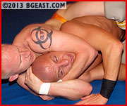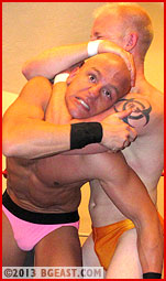 As the action unfolds, these two consummate pros dish out equal parts highly skilled wrestling technique and ego wounding trash talk. They trade precise, painfully lingering holds like chess masters, setting up combinations three and four moves ahead. Expertly working Lon into a rear naked choke, Paul snorts, "Who wears pink anymore!?" The veins in the bodybuilder's shaved scalp bulge as he struggles to fight off unconsciousness. Many an opponent at BG East have learned what Paul discovers: it is never safe to count out Lon Dumont a moment too soon. With a slick counter, the bodybuilder escapes, softens up his opponent with a rib crushing bearhug, and then snaps on an airtight sleeper from behind. Slowly, horrified, Paul fades until his entire body goes slack in his opponent's arms.