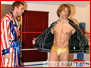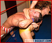When the action tumbles outside the ring, the overly enthusiastic BG boys at ringside revel in the opportunity to land a few blows of their own. Audience-participation ass-spanking, face-slapping, and gut punching turn the tide back and forth as the boys try to swing momentum behind their favorite. The extra adrenaline pump of wrestling in front of an audience push both accomplished grapplers to the edge of endurance and exhaustion. Two phenomenal physiques, two sets of devastating ring skills, and one festering score to settle make this a Wrestlefest extravaganza that will leave you gasping as well!