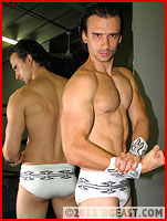 Just look at these two guys and you see how opposed they are in attitude and style, like fire and ice. Diego, with his long hair, totally ripped muscular build, and flashing eyes, is as wild and headstrong as Rio - composed, meticulously groomed, and baroquely chiseled - is suave. Since forever, these two men were meant to come to blows. The moment Diego made his BG East-exclusive debut and caused an absolute sensation, especially among fans of hot Hispanic hunks, a very curious (and dare we say jealous) Rio was on the phone grilling the office about this new "star" and apparent rival. Rio is happily accustomed to being THE Latin heartthrob at BG East. Long, lean Brazilian interlopers beware!