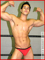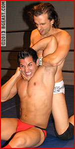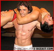 Diego, on the other hand, has designs on Rio's self-crowned title! He takes the first fall with a camel clutch that's more camel "choke" than typically applied and forces a gasping submission out of Rio. Our Mexican muscle mag model moans and writhes deliciously on the mat while Diego takes his turn at the mirror, laughing contemptuously, smugly saying, "Look at this!" as he kisses the peaks of his biceps. As soon as Rio gets back on his feet, Diego lunges into him, smelling blood and cornering his adversary for the kill.