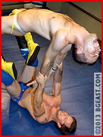 "Poor, fucking jobber," Jonny mutters as he shoves his hand down his trunks again to adjust that notable bulge. Don't be fooled, however. There isn't a shred of mercy in Jonny, and once he's done delivering precisely the back, crotch, or leg torture you ordered, he's more than ready for you to decide what happens to Drake next. Do you have a taste for corner and rope abuse, neckbreakers, or headscissors? It's your call, once again, but you can trust Jonny to serve up just what you're ordering with his particular flare. For example, one way or another, Drake's irksome undies are going to get ripped off, leaving him bare-assed, vulnerable in nothing but a jock strap. And whatever method of destruction you select, Jonny has a boatload of ego-crushing trash talk and humiliation to sweeten the pot.