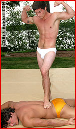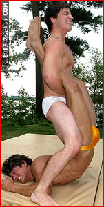 Whatever bromance that seemed to be growing on the dock has been decisively stomped out, buried, and pissed on well before these stunningly built hunks decide who the "real wrestler" is here. Egos are insulted too much, bodies stretched too far, and there are one too many mouthfuls of turf for this match to end with anything other than one cocky hunk brutalized and his abject pleas for mercy resoundingly ignored. "Come on, scream!" the winner demands. "I wanna hear you!!!" And slowly, reluctantly, the better, tougher man gets his wish. "And to top it off, I don't really like you too much!" he snarls, knocking his opponent out cold with an intimate, unrelenting figure-4 headscissors choke, and putting to rest once and for all the potential for a sweet bromance. Leaving the loser face-first in the lawn, the winning stud returns to the dock to work on his tan.
