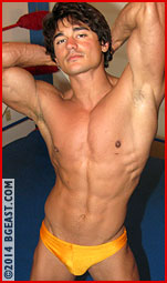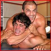 "Fuck you!" Kip cries in protest, merely inciting a series of increasingly horrific assaults. Guido rips him apart, joint by joint, battering every beautiful inch of Kip's ripped body. The indy muscle monster takes advantage of every inch of the ring, trapping the bewildered beauty in the ropes and crushing him in the corners. Guido's diabolical machinations can't be contained within the ring, and the bearish brute throws the helpless rookie out to the floor. Before Kip can catch his breath, his mammoth opponent drags him up by his trunks (wedging them high up between Kip's sculpted glutes), effortlessly hoists the bashed beauty into the air, gorilla-pressed overhead before being flung over the ropes and back inside the ring! There's nowhere for the delicious, doe-eyed Ken doll to hide. There's no avenue of escape. And wave after wave crashes down all over Kip's award-winning body.