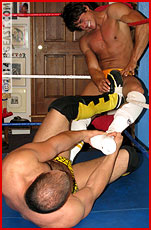 These two wrestlers are stunning in their contrasts. Kip is lean, tanned, toned, and beautiful as ever in extremely brief orange trunks. Guido is massive, hairy, and built like a Mack truck, with his bubble butt squeezed into yellow and black spider-web briefs. "Come on, you pretty, little fuck!" Guido taunts, nearly snapping Kip off at the elbow with an armbar. "I'll make you get the fuck out, you little bitch!"