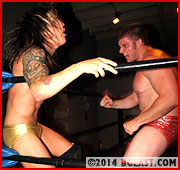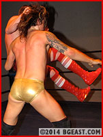 Like most heels faced with a lighter, lean and very longhaired opponent, Bobby finds Lucky Loko's luxurious locks an irresistible target. He yanks it, twists it, swings Lucky around the ring by it. (Who knows what the kid's thinking... not only is he picking fights with dudes who sport an intimidating fifty pound weight advantage over him but he's also growing his hair long!) "You got me workin' up a sweat," Bobby says accusingly, then spits into the palm of his hand and slaps it to Lucky's six-pack abs. The smack resounds in the arena.