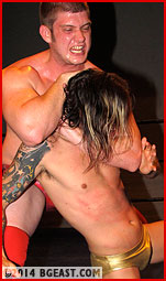 Lucky absorbs every blow, throw and utter indignity until Bobby gets tired of dishing it up and moves on to a new punishment. Finally Lucky submits under the pressure of a prolonged and punishing full nelson that nearly snaps his neck. At the start of Fall 2, it looks like Lucky might be able to turn the match around after he dodges a clothesline attack, but a pulverizing and very sexy bearhug seems to slam that window of opportunity shut.